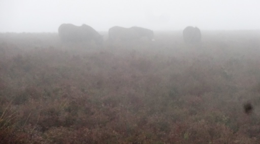 I’d looked on this OS Explorer map to find a good place to go for a short walking, picking somewhere were there was parking near a possible short circular walk (the Dearest Progenitors wouldn’t be all that able to do a longer walk), and so go there we did, and set out onto the moors – it was getting rather foggy, as it happened, and so we saw sheep and some of Exmoor’s population of wild ponies suddenly loom up out of the mist every now and again, which was very dramatic!