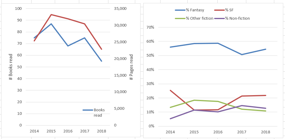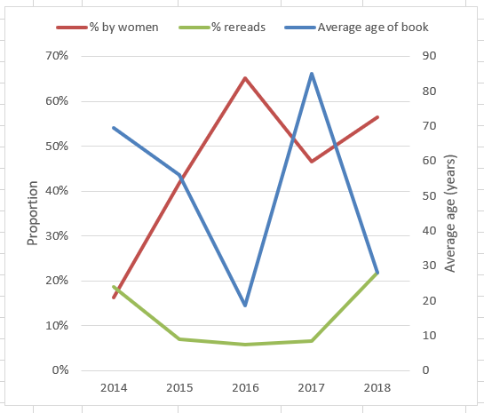 Now, as the red line in the graph above will tell you, that has drastically changed since. Around 2014 was probably a time when I was becoming familiar with and accepting feminism and identity politics, which I suppose fairly naturally led me to appreciate a different kind of novel, plus I did most of my discussing books (and getting recommendations) in the Oxford Tolkien Society, which was a very lefty and diversity-focussed space. So in the end that happened without me making much effort to change what I read. However I do fear I might have gone a little too far, in that I will admit that I do now usually notice the author’s gender (where it’s obvious, and probably based on dodgily assuming from their printed name…) pretty immediately when I pick up a book I’m considering reading/buying etc., and do look more positively on it if it’s by a woman, which isn’t the fairest thing to be doing.