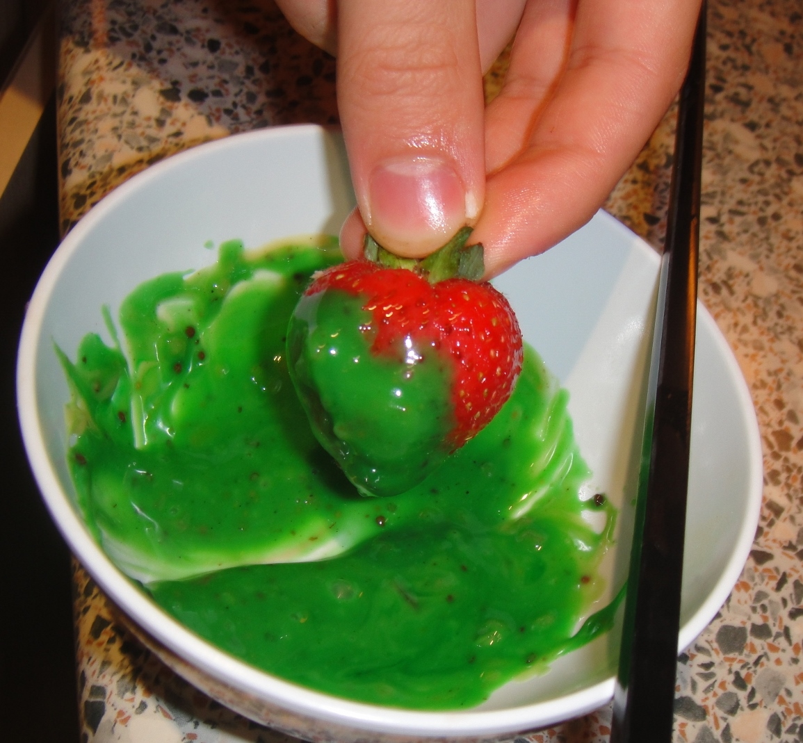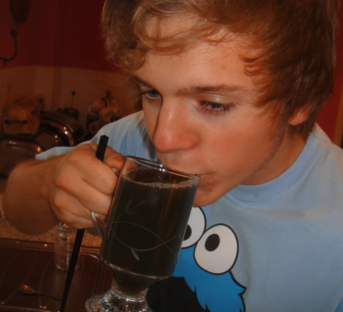 Sometimes I’d go over and it would be just he and I, and we’d spend the time talking or doing assorted very silly activities, notably silly cooking. Cabbage and I had a seemingly inexhaustible appetite for seemingly disgusting-seeming combinatons of foodstuffs, and one of our favourite activities was putting this into practice. On the occasion pictured, we seem to have got our hands on some food colouring; hence the chicken wing with blue mayonnaise, the strawberry in green chocolate, the blue milk and the black orange squash.