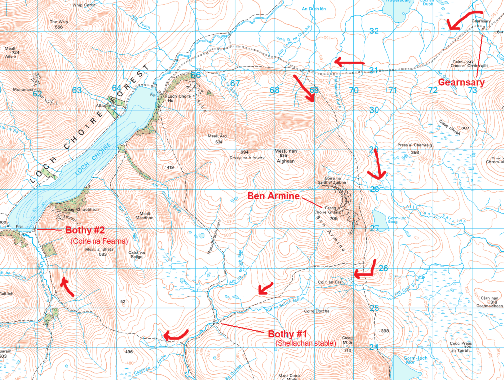 Our plan for the day (scroll down for map) was to, from Gearnsary, continue along the track we were following the previous day for a few miles, until we’d turn left onto a track that would take us southwards along the eastern edge of the Armine Forest. We’d then ascend to the Forest and hopefully go up Ben Armine itself, before walking across the Forest to one of two bothies in the area, where we’d overnight.