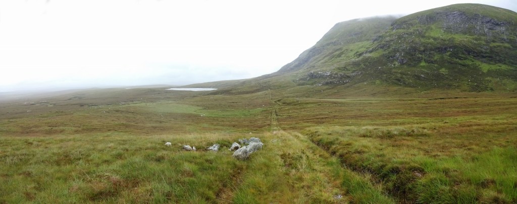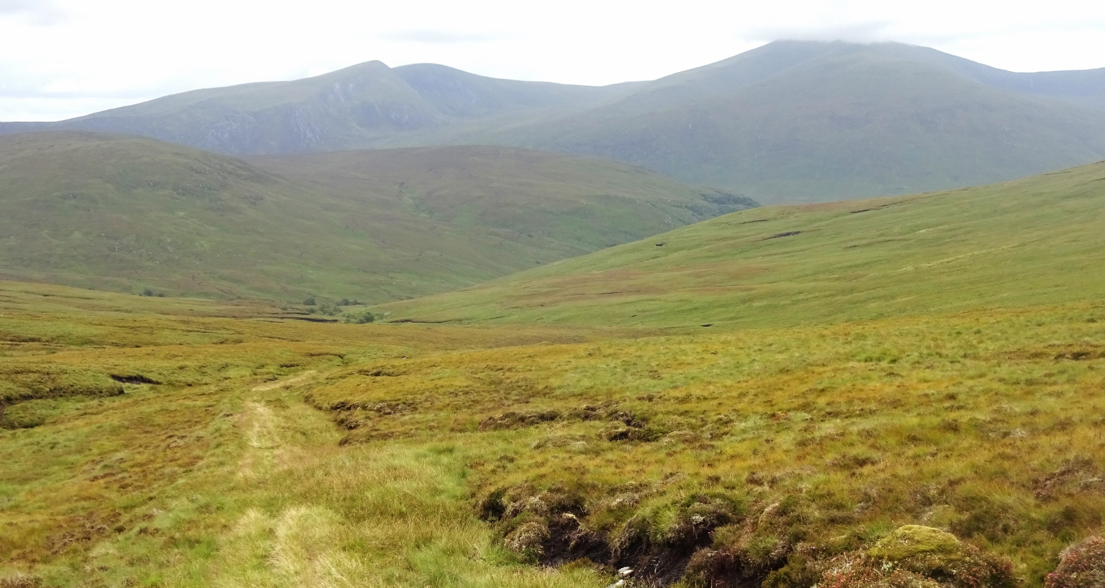We set off from Gearnsary a little later than planned, perhaps, but otherwise well after an entirely adequate night’s sleep in the admittedly rather creaky bothy. The first sections of the walk passed pleasantly enough, andd with no barriers bigger than mud, squelch and streams as we made our way along the track and then the footpath. It was a grey, moist day, but not raining, and the view to our left was very desolate and empty; while Ben Armine on our right looked rather imposing – the mountain is rather round and flat on top, but has very steep slopes on the side leading down to our path.