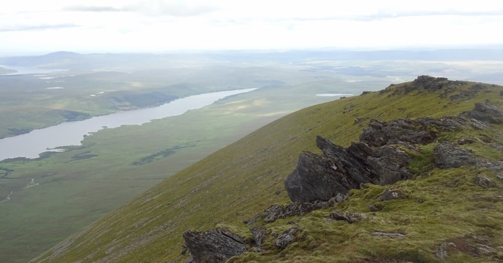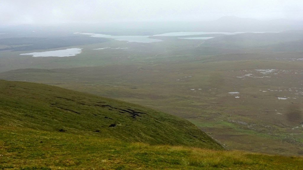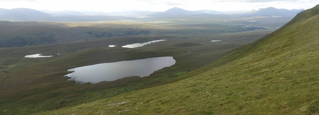 And that was it! Climbing Programmer had got me once again. It had just started to rain, and after we stood around talking for a bit, we walked just a little further up the path to the bealach to look at the view down the glen before we turned around. And the view was wonderful, over Loch a’ Bhealaich to Loch Choire and the high ground of the Armine Forest in the distance.