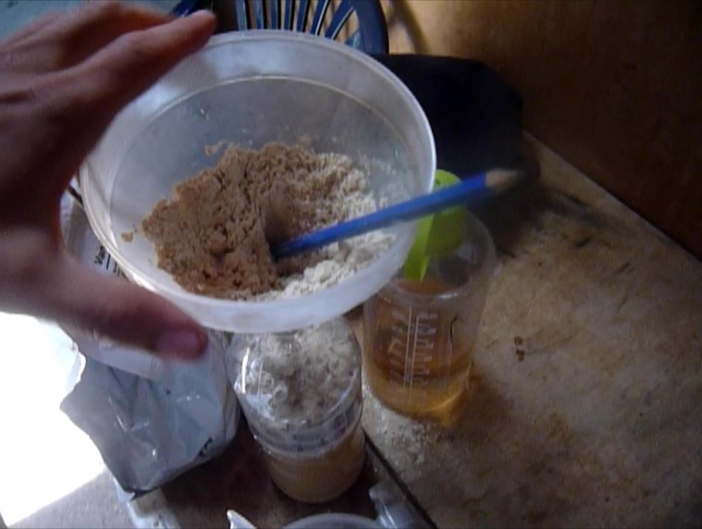 Now Huel comes in powdered form, and needs to be combined with water either with a blender, or in a shaker equipped with a plastic mesh that breaks up the powder into a not-too-lumpy shake. Without his shaker, therefore, Hueler was left in a rather sticky situation – especially since we had no sealable container with a wider neck than a water bottle, so couldn’t get the Huel into anything else to shake it in. Here follows a transcript from the video Huel diary that Hueler kept to send to one of his friends – the person who got him into Huel, if I recall correctly: