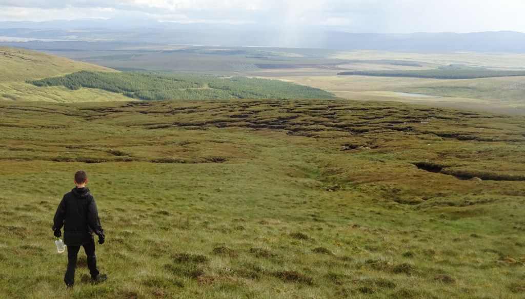 The ascent went smoothly if a little slower than anticipated – initially we were lumping our way through fairly dense scratchy scrub, but the vegetation thinned out quickly as we got onto higher, flatter ground. We also had some trouble with what I found out later are called peat hags – I was calling them “peat cliffs”at the time – winding clefts in the peaty ground, maybe six to ten feet deep. Over a section of our route, the hags were very inconveniently arrayed transversely across the direction we wanted to travel, giving us the perennial choice of whether to walk a really long way around each one to an easier crossing point, or attempt to climb down into it then up the other side.