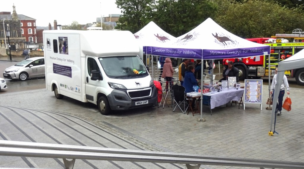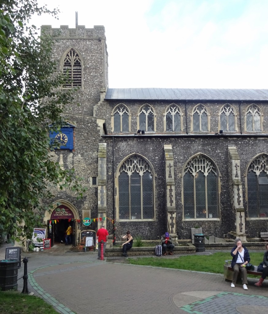 I found an unexpected small outdoor car park in very central Norwich (it being necessary to avoid multi-storey jobbies [1] due to having the roofbox on [2]), and went for a brief wander to find a toilet. I found an antiques shop in an old church, where a man tried to speak to me first in Hindi, then in Arabic; and I eventually located some toilets in the city library – it was a very nice, big, open public building, with a café on the ground floor, and some kind of exhibition on disability pride was going on.