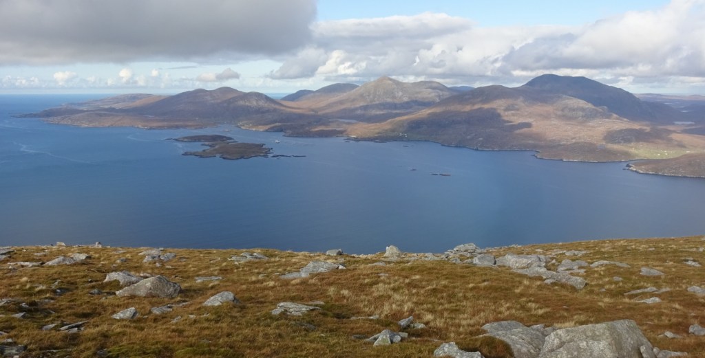 I always enjoy going up to Harris, and this time I did something I’d been wanting to do for a long time: the Sunday was very sunny, and I took advantage of it to do the pathless walk from our cottage up the hill Beinn Dhubh, which is the highest hill on South Harris, and perfectly located to give amazing views in every direction: to the north you look across West Loch Tarbert to the full range of the North Harris hills, to the east you can see across the bays of East Harris to Skye and the mainland, to the south you can see down the chain of the Western Isles to the Uists and Benbecula, and to the west is the giant Luskentyre beach and Taransay. It was well worth it!