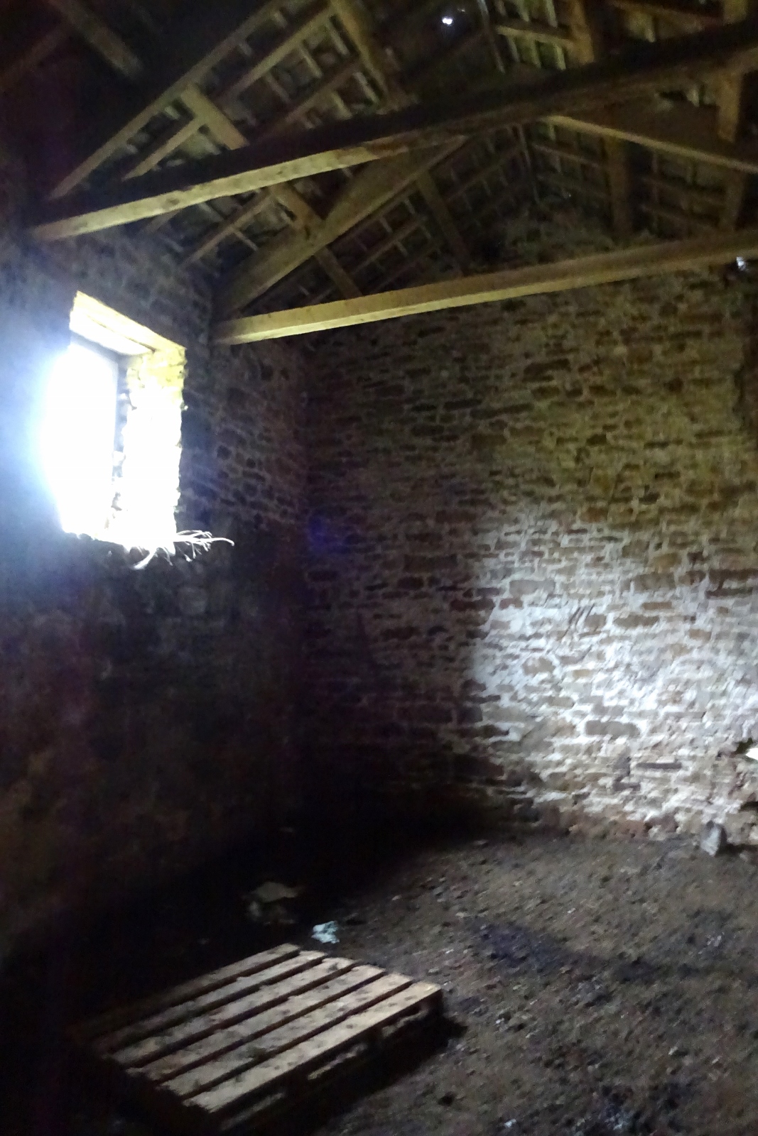 In the afternoon, though, the rain ceased for a little while, and Millicent and I decided to venture out briefly. We walked a little way up the hillside on a very muddy and slippery path (we eventually got to the top only by making heavy use of tree-branches for support), and investigated one of the bewilderingly many stone barn-like structures that were dotted around the valley.