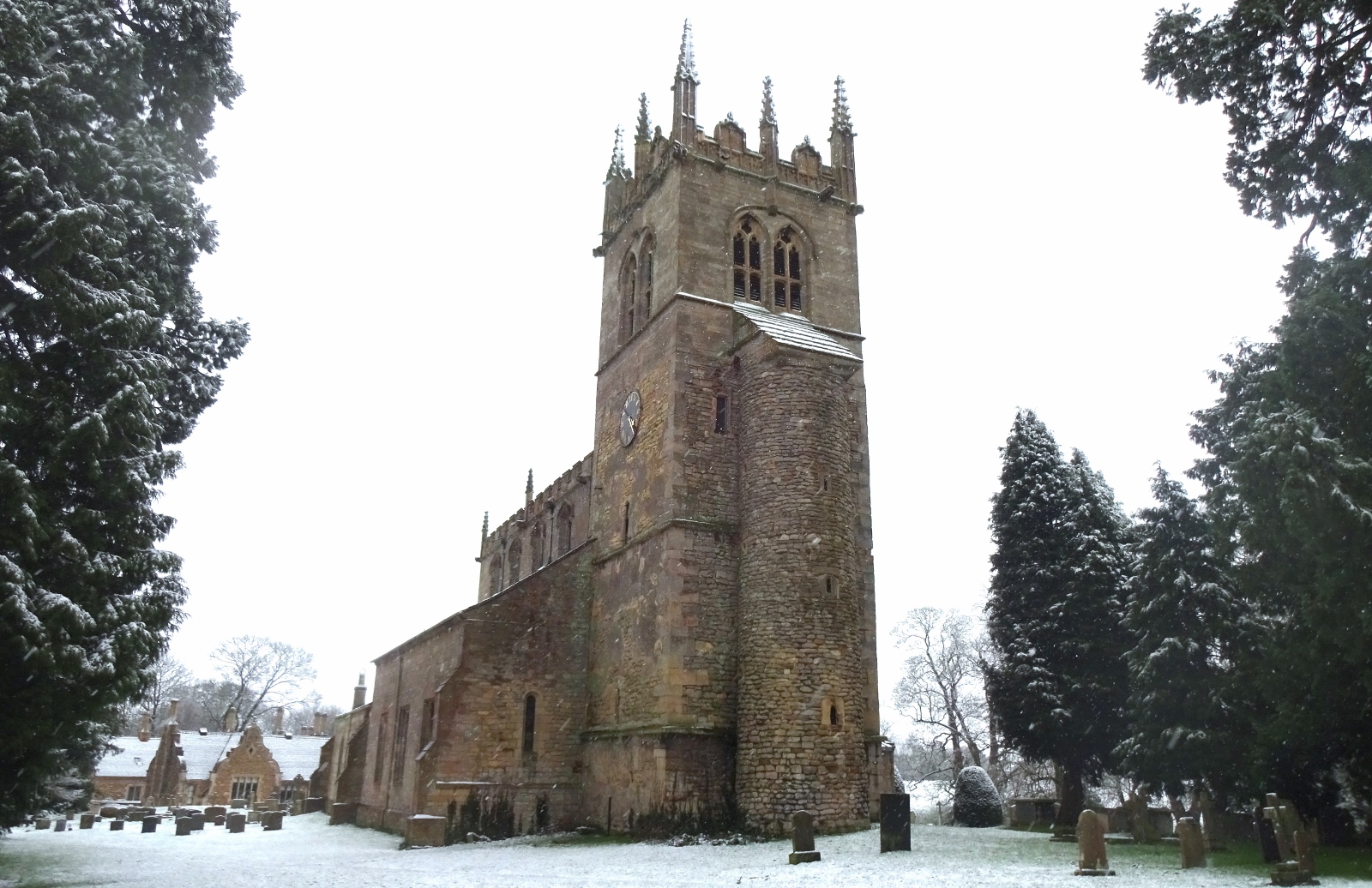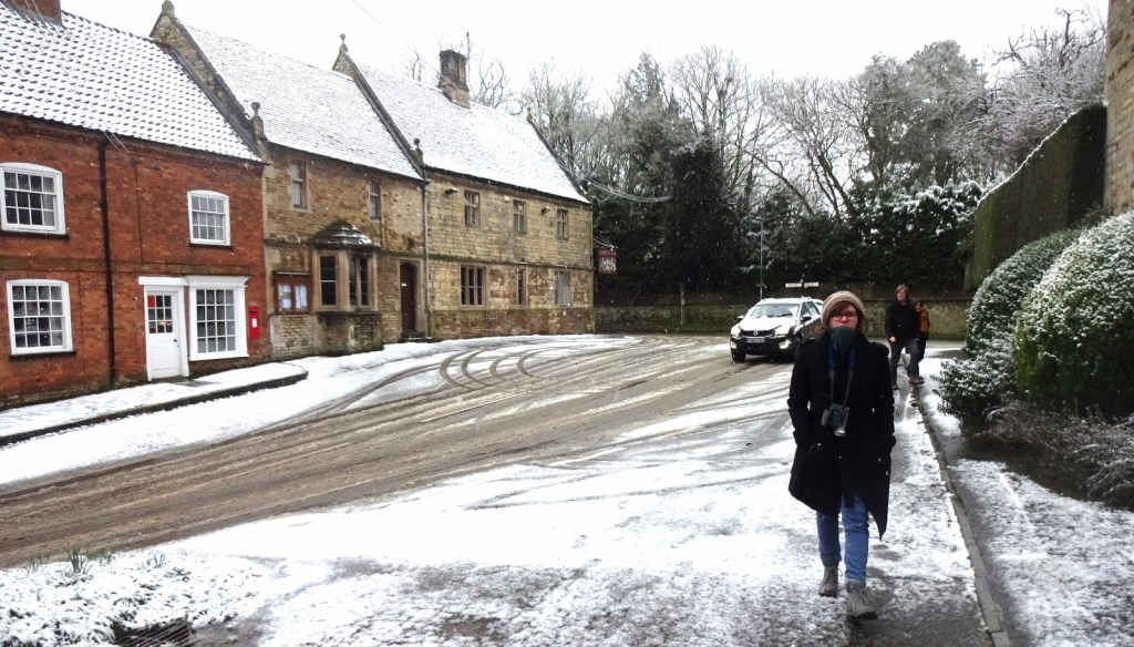 After the pub, there was another hour or so of driving before we left the A1 for our next stop (and the one bringing us to this map area), the Lincolnshire village of Hough-on-the Hill, which Millicent had identified as having an interesting church for us to visit. To our delight, as we made our way along progressively smaller roads towards the village, it started snowing!