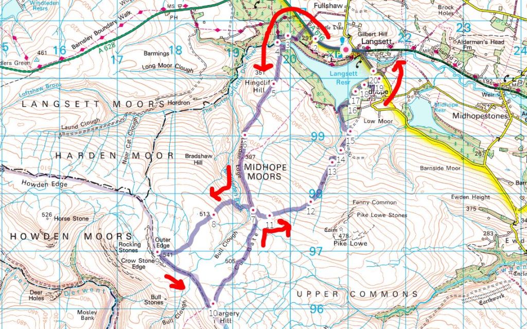 The route had us park by Langsett Reservoir and walk around it, before taking a bridleway up into the hills. We’d go off the bridleway on a path that was marked on the newest Explorer mapping on the OS maps website, but which my older paper map (and the digital map in my handheld GPS decide) didn’t know existed, and neither did the Landranger. That footpath seemed like the best bet at some good isolation, but if it looked too boggy we’d stick to the bridleway. The path would take us to the peak “Outer Edge”, from which a footpath led south-east back to the bridleway, which we could then follow all the way back to the reservoir and circuit around its other side back to the car – or if the ground looked good, we could take another new footpath to avoid the repeated section in the middle.