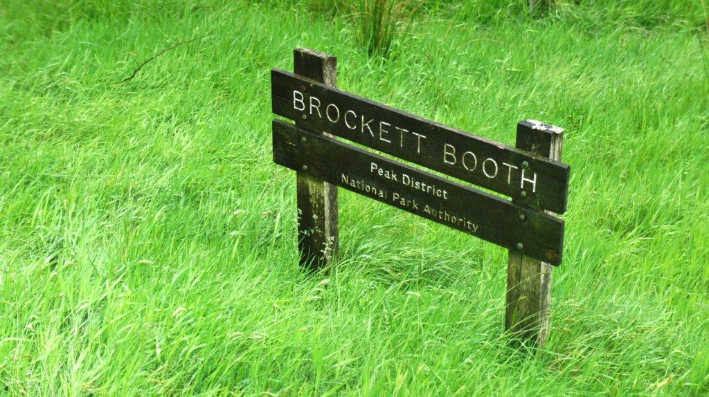 We then drove somewhere else to start our walk, which took through dry-stone-walled fields and quite dramatic, craggy (and sheepy) valleys up to a high ridge, and through a forest on the descent. It was that forest that let me find our location: I have a photo of a sign reading “Brockett Booth”.