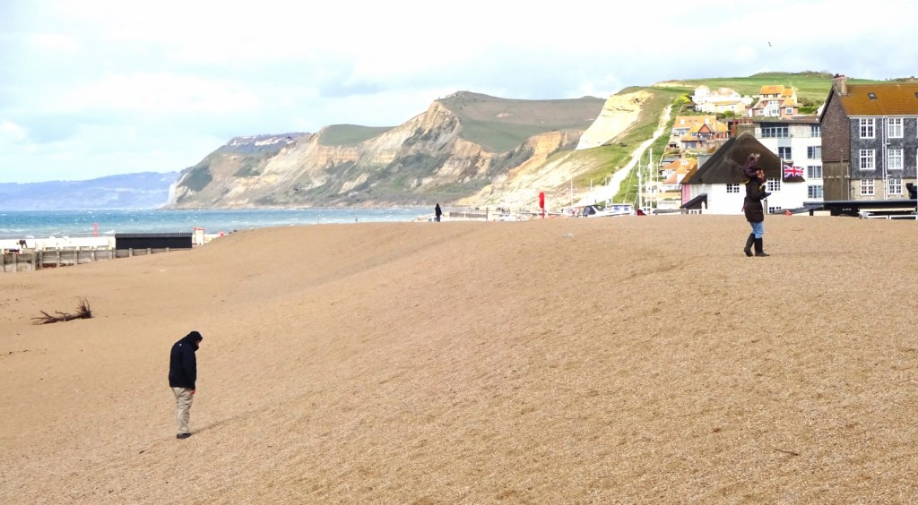 West Bay seemed like a classic small English beach resort town – lots of shops selling ice-cream, fridge magnets, plastic spades, fish and chips; an amusement arcade and so on. It was very windy when we arrived, but clear and sunny, and there were several brave souls sitting around on the beach. Our route took us up and out of West Bay via various residential streets full of fancy-looking holiday and retirement homes, after which the next couple of miles were pretty, hilly green countryside, with the sea occasionally showing through gaps in the cliffs.