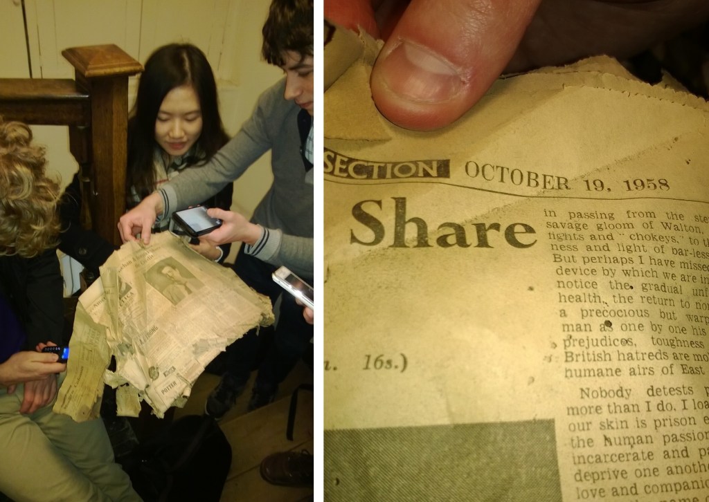 On one occasion, when sitting on the stairs awaiting entry into our tutor’s room, we decided to open a cupboard in the stairs, and found it to contain a large, messy, dusty pile of newspapers, the top one of which dated from 1958!