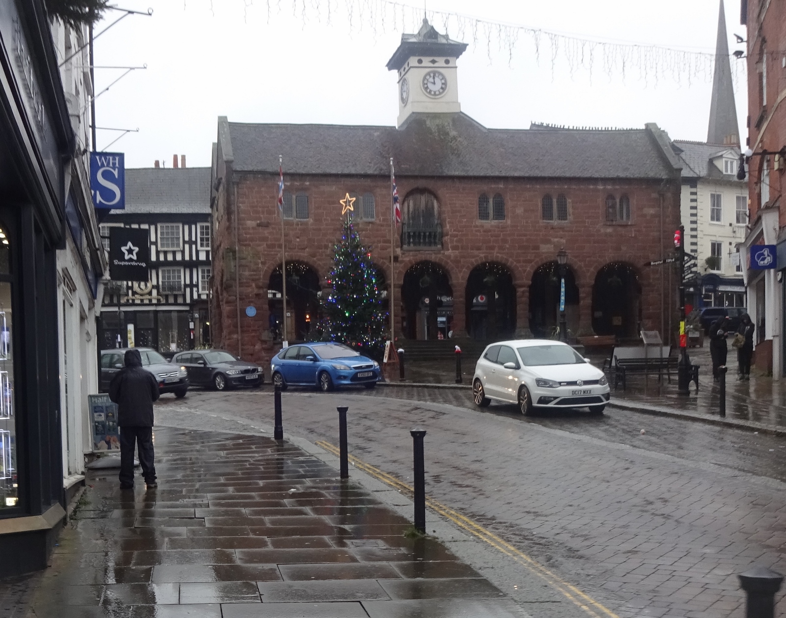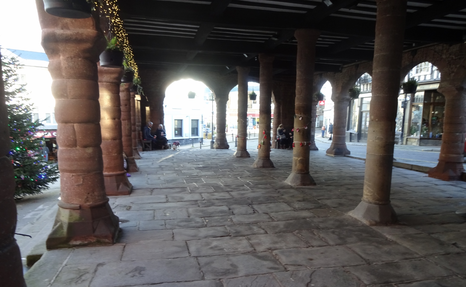 Our trips out included a couple of short walks in the area, one rainier than the other, and, logically enough, a visit into Ross-on-Wye. Ross is apparently well-known for its antique shops, but unfortunately, with us visiting it on a bank holiday – due to Christmas falling on a Saturday this year, the 27th and 28th were bank holidays – these were all closed! Nevertheless, we had a good wander around town, and admired the very interesting 17th-century Market Hall, under which markets are still held regularly, and which holds a commanding position at an intersection.