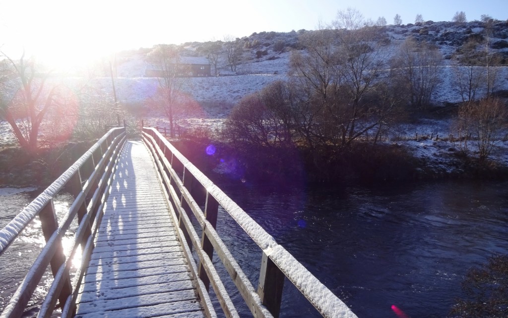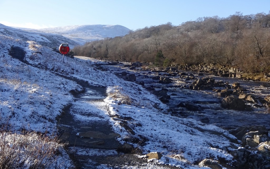 In the end, the driving went fine, and after a couple of stops to admire the snowy scenery along the way, we arrived at the car park of the High Force Hotel, who have managed to establish themselves in the enviable position of charging people who come to see the falls both for parking in their car park, and for access to the most direct path to the falls. We said no thank you to the latter though, opting instead for the public right of way next door. Our route took us across the River Tees on a footbridge, before climbing gradually to a viewpoint over the top the falls over a mile or so.