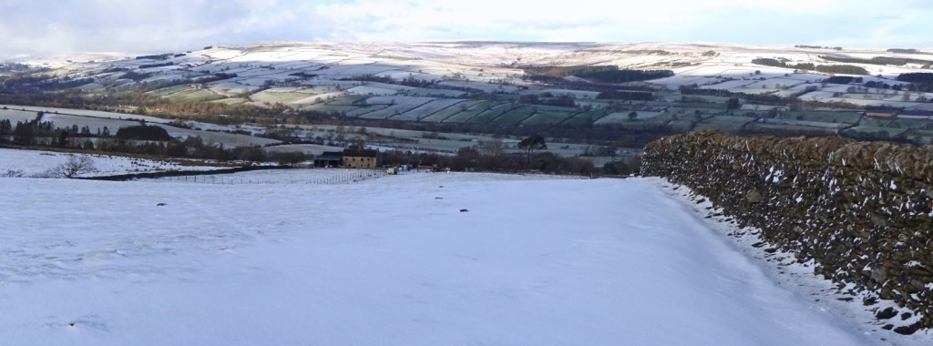 The snow had cleared up a little since the falls of earlier in the week, and some fields near the valley bottom were mostly green again, but there was still plenty of snow around higher up the sides of the valley, and it lay in great deep drifts against the dry-stone walls dividing the fields.