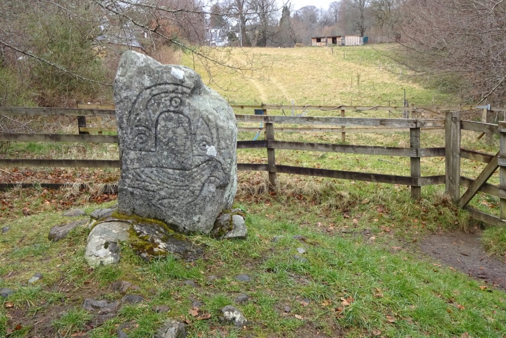 The stone is pretty easy to get to, standing just a little way up a public footpath from the centre of Strathpeffer, in a field with rather dramatic views down the valley. We were surprised by how clear the eagle carving is – I couldn’t have told you it’s an eagle rather than some other bird, admittedly, but there was no squinting required at all to see the designs. There was a sign advertising something called the Highland Pictish Trail, which looked rather interesting – a long-distance trail connecting together various Pictish sites. That would be fun to do some of one day!