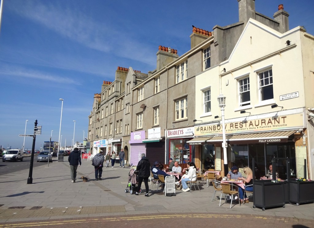 Getting off at Hastings, I walked eastwards along the seafront, which was already very busy at 10am. It was a pretty quintessential English seaside resort town seafront: a pier, arcades, shops selling fridge magnets and little buckets and spades, little seafood stands of the whelks and jellied eels variety, and of course a mind-boggling number of fish and chip shops and independent cheap restaurants and cafés of the laminated-menu variety. I amused myself by skimming every chip shop menu looking at what veggie options were available: in some places it would be just chips, onion rings and mushy peas, but others looked much better: not just veggie burgers and garlic mushrooms, but cheese and onion pies/pasties, spring rolls, and in one case, imitation fish!
