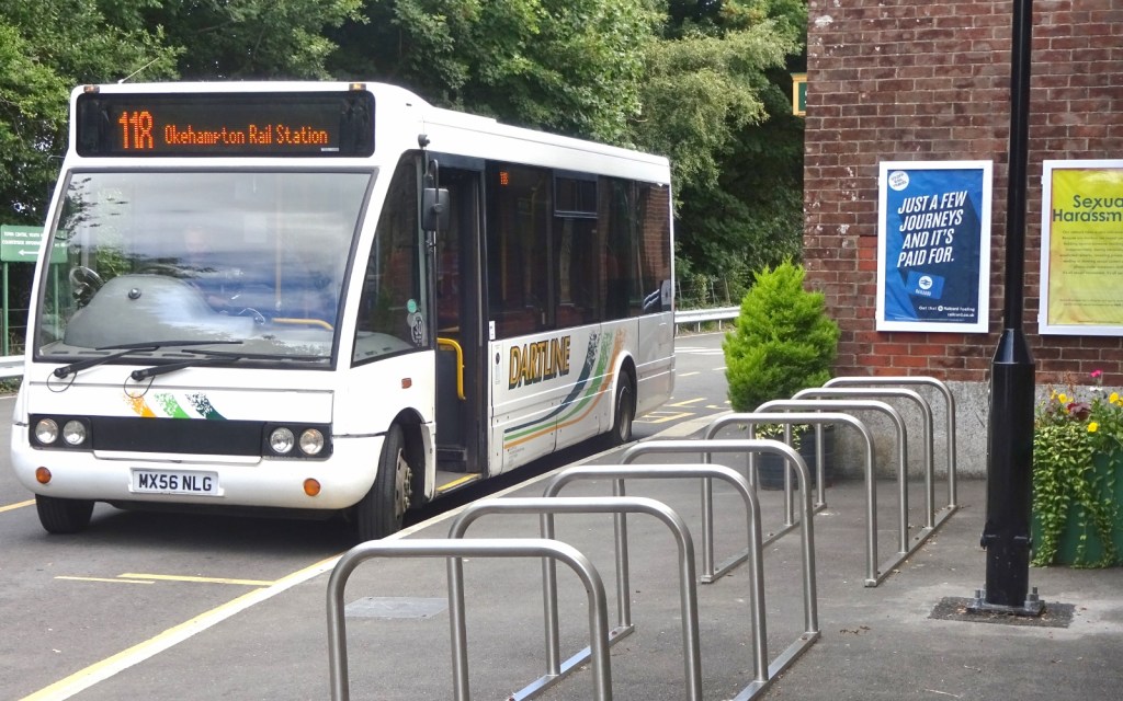 Immediately after crossing the bridge – from which I could see Dartmoor once again – I descended to the river, and walked along a pretty forested path to the hamlet of Bedford Bridge, the endpoint of my walk. After ten minutes sitting in the driveway of a retirement home – since the bus stop I’d be departing from was right in the road so not very conducive to comfortable waiting – the #1 bus arrived from Plymouth to whisk me back to Tavistock. At this point, I made a bit of a miscalculation: I knew I’d be taking several more buses that day – first to Okehamption and then all the way from Axminster to Weymouth along the Jurassic coast – so I spent £9 on a Devon day ticket. (While this was train holiday, I was making use of buses occasionally to fill gaps in the network, avoid having to double back etc – this was the most bus-heavy and train-light day of the trip!) However, due either to most of the latter route being outside Devon, or it being different bus companies, this ticket was invalid for most of my day’s travel – so I rather dramatically overpaid there. Oh well!