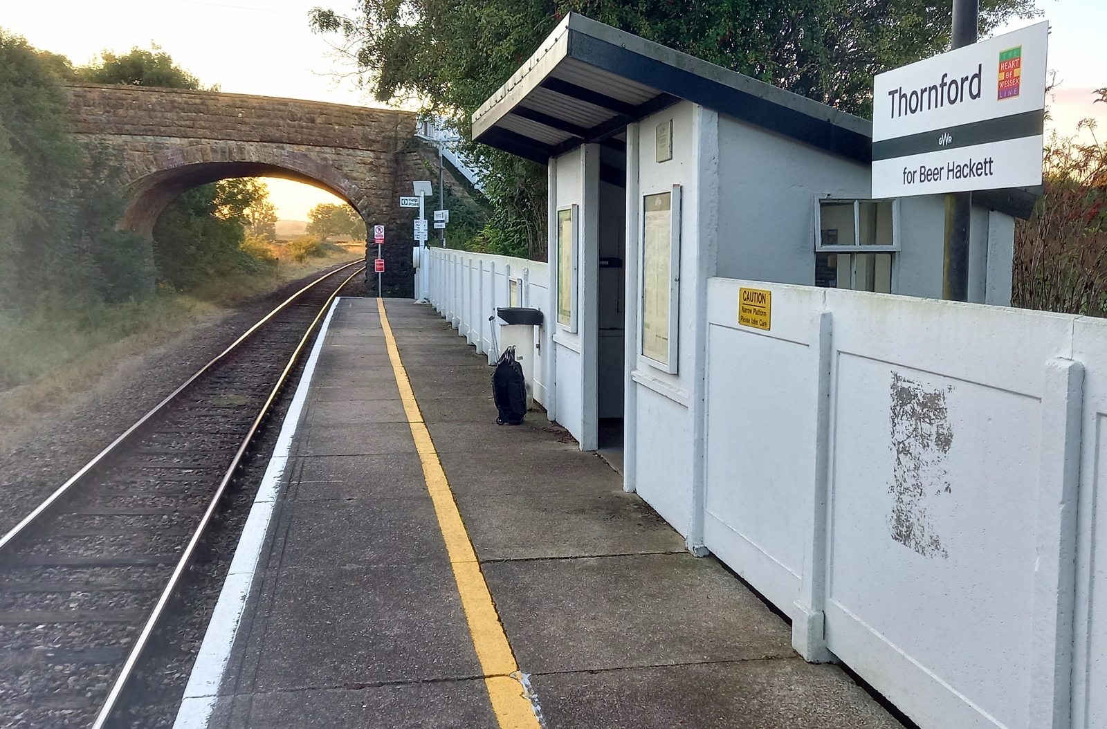 Thornford is a tiny station, used by about 10 people a day on average, and quite pretty, with the continuing sunrise visible under the stone road bridge. Like Yetminster, it’s a request stop, and so I got to enjoy my first ever experience of flagging down a train! I’m glad to report that the train stopped as intended.