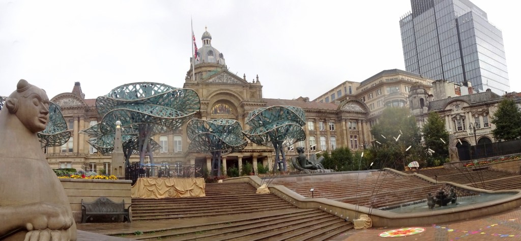 The area I was walking through was very much the “museums and civic buildings” part of town, and was pretty impressive. I enjoyed the slightly odd giant tree sculptures that were up in front of the Birmingham Museum in Victoria Square. Unfortunately, just after this, there was an onslaught of sudden heavy rain – I got out my raincoat and put it on but still got rather soaked from the waist down. [2]