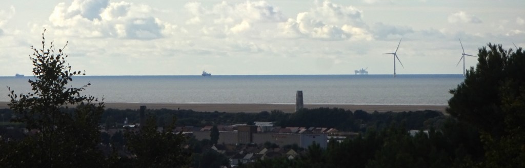 I therefore instead got off the train just one stop early, at Upton, for a forty-or-so-minute walk over to Birkenhead North station, which would take me through the green space on Bidston Hill. The walk was pretty nice! There was a nice open heathy space on top of the hill, with an old windmill at the centre. Most notably, there were long views out both westwards over the Irish Sea, where I could see countless wind turbines disappearaing into the distance, and eastwards to central Liverpool.