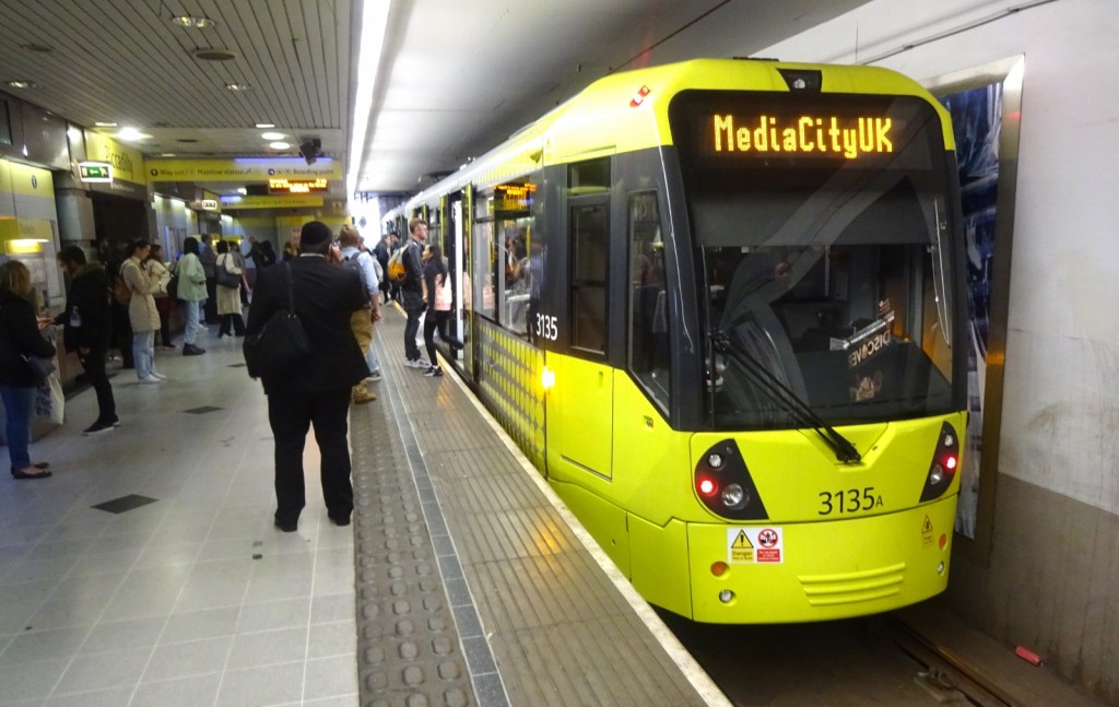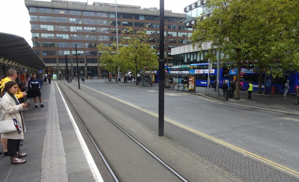 I therefore had the morning and early afternoon to myself, and decided that I would do some more relaxed local exploring, getting a train eastwards on the line towards Glossop and Dinting, which I’d heard good things about, and where I thought I could fit in a nice walk. Rather than return to Piccadilly station where the trains start from, for a bit of fun I thought I’d walk to the nearby Piccadilly Gardens tram stop instead and get a tram out eastwards a few stops to Velopark, where I could walk to Ashburys to join my train one stop out of Piccadilly.
