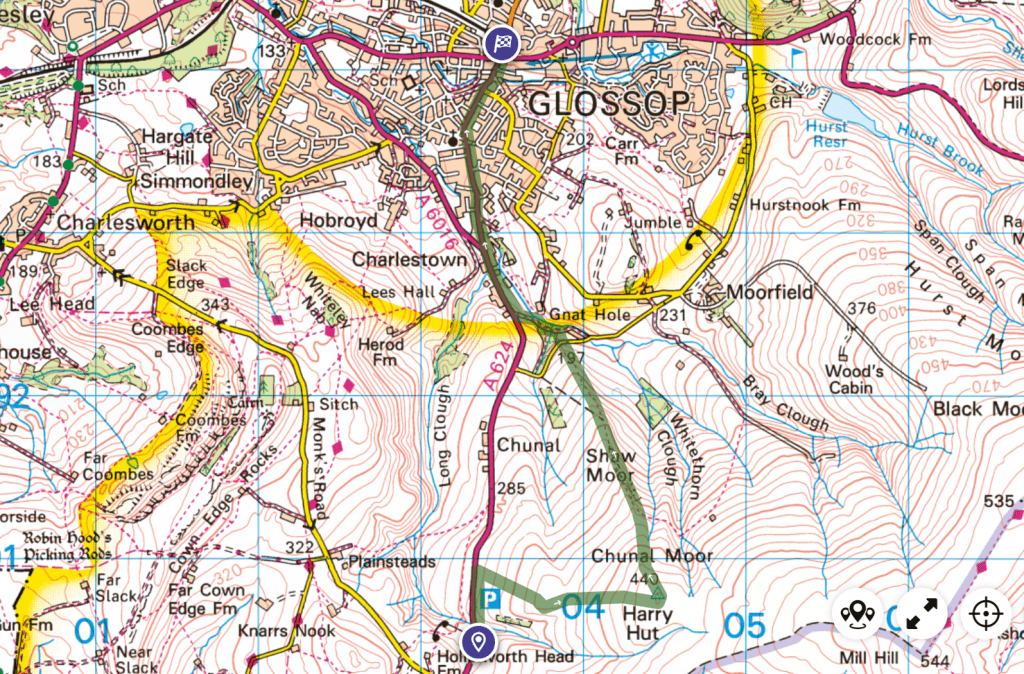 Glossop seemed a very nice town, with grey stone houses overlooked by the hills of the Peak District. Arriving there, I popped into M&S to buy some lunch for later, before setting off on the walk I’d chosen: I’d head southwards out of Glossop to walk up the curiously-named hill Harry Hut.