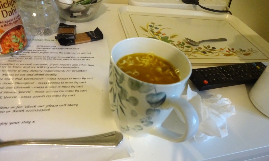 Getting off the train, I walked through the village in the low afternoon sun to my B&B for the night, which was on an outlying farm. There, the owner welcomed me, and when I said I’d probably be leaving too early for breakfast, kindly offered that it’d be no problem to cook me breakfast at 6:30am – it being a farm, they’re up early anyway. I went up to my room, and had a relaxed evening, putting together the somewhat odd dinner that was the best I could assemble from the shops open late on a Sunday in Weymouth, and getting to bed early for my early start the next day!