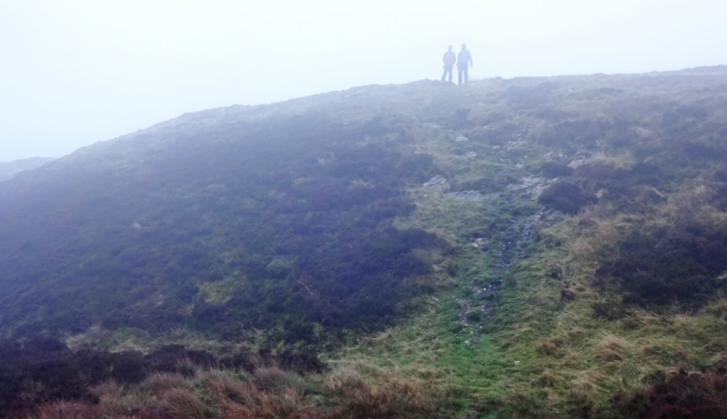 We reached the summit of Moel Sych in pretty good time, unfortunately still unable to see the views, which I understand are rather spectacular in clear weather. Given the windy conditions, we hung around for only a short while, before beginning the third side of our roughly square-shaped path, descending towards the waterfall Pistyll Rhaeadr. Rice Pile’s knee had started giving him trouble towards the end of the ascent, so we took things slowly, taking plenty of breaks, but fortunately the descent was more sheltered, and after half an hour or so we got out of the clouds. On this leg, we also started encountering other walkers for the first time – we’d been entirely alone so far.