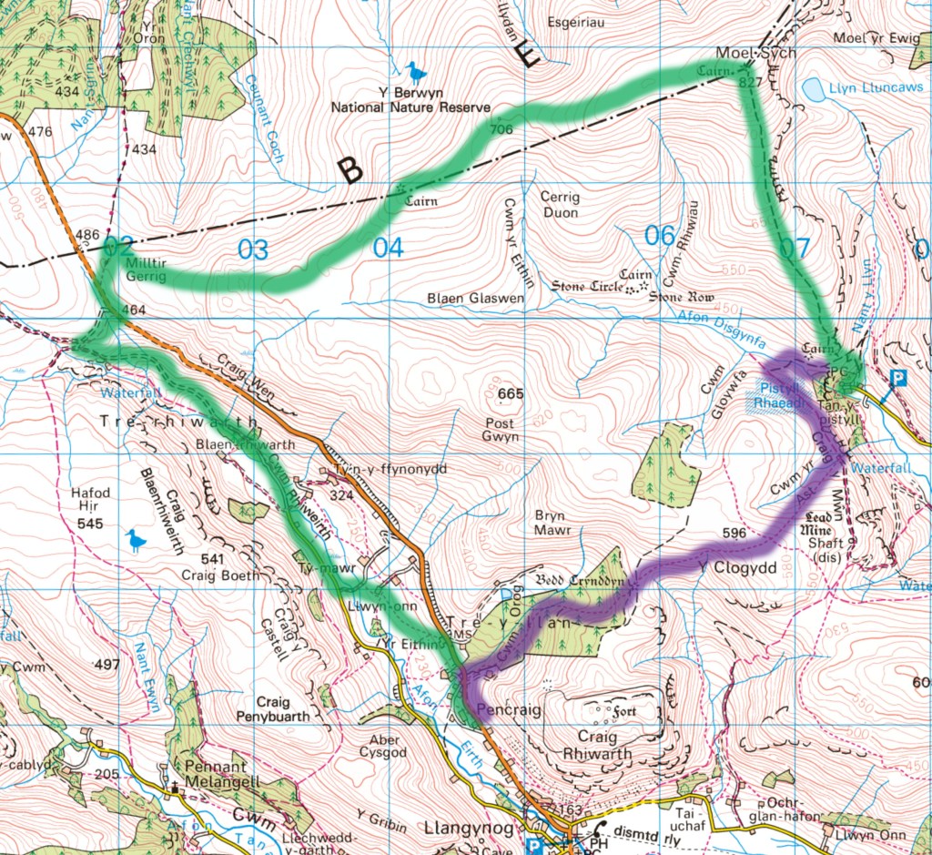 I’d planned a circular route of about 12 miles, which would take us first along the valley Cwm Rhiwerth, before ascending to the peak Moel Sych from the west. We’d then come down to the waterfall Pistyll Rhaeadr, then head back up over the hil Y Clogydd to our parking spot.