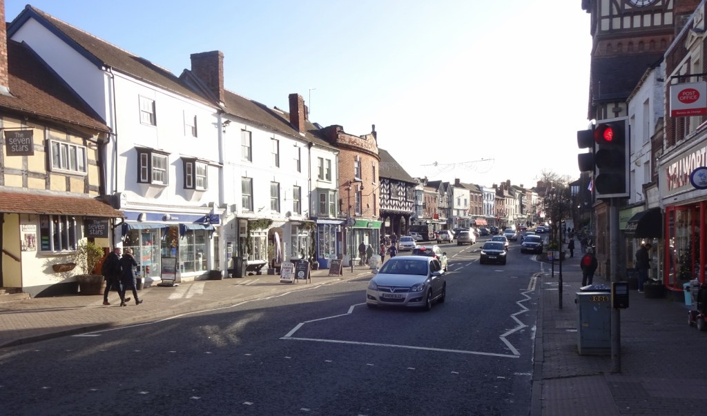 Our walk took us a couple of hours, so we finished before noon, hungry but not yet feeling justified in getting out the packed lunch. We had plenty of the day still left, and wanted to do another walk back in the Hereford direction, but were in need of a toilet stop before then, so we drove the 15 minutes or so over to Ledbury, still in this map area. There, we ate our sandwiches in the car, before getting out to potter around the town. Ledbury was very nice! There was an interesting selection of shops, cute old buildings, and a cool half-timbered market hall. After a wander, we sat down in a café for some tea and to use their toilets – I had a minty hot chocolate that was, alas, rather over-swet, before going back to the car to drive on to our next walk over by the River Wye, and out of this map area.