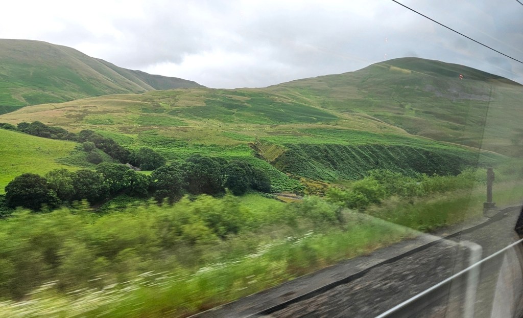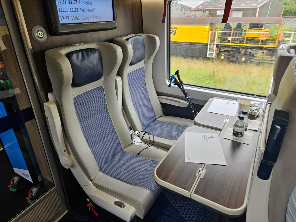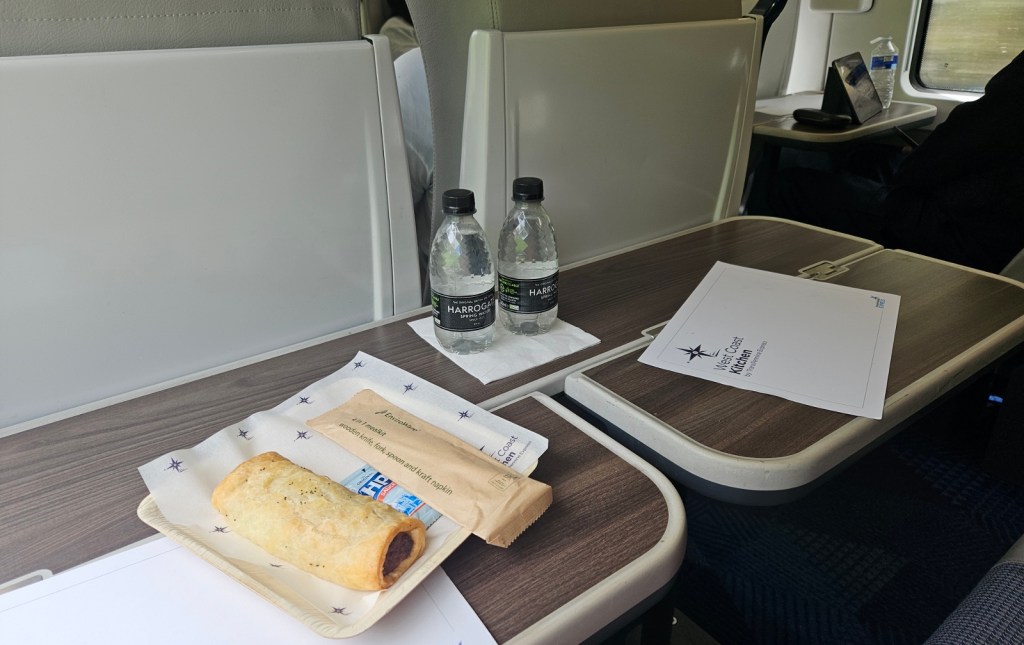 The next day, I continued on the train up towards Aviemore, getting first an Avanti train from Wolverhampton to Preston, then a Transpennine Express train from Preston to Glasgow Central. I treated myself to first class on that second train since there was a good-value Advance ticket available, and was fairly impressed! I like the design of their first-class cabin; it felt very light and airy. I had their vegan sausage roll from the catering, which was rather tasty if unfortunately soggy, having presumably been reheated in a microwave.