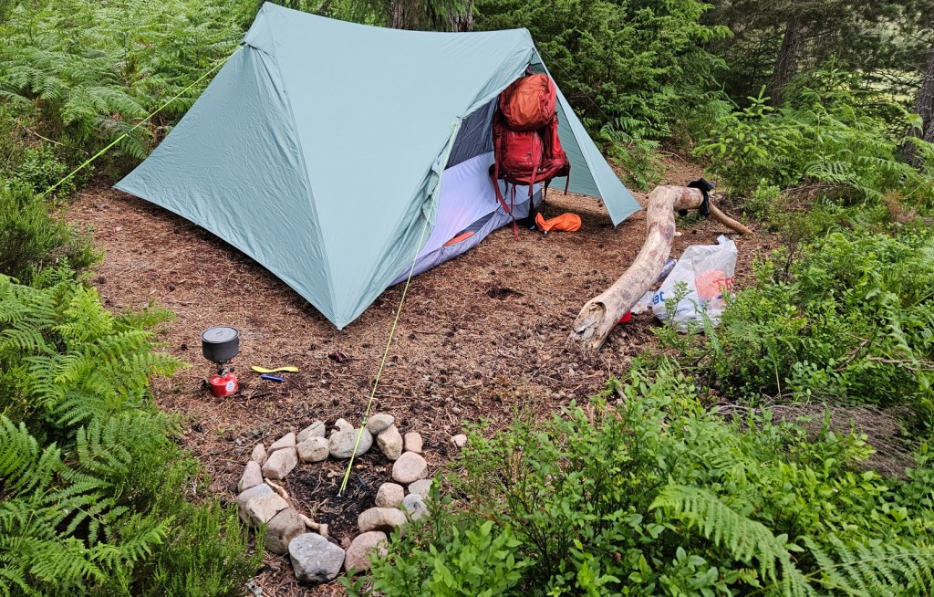 Arriving at Loch Morlich, I could see across to the slopes of some of the Cairngorms, though the highest tops were in the clouds. I didn’t go to the big caravan park, but instead followed the footpath around the loch to the southern side, away from the road, then went off it a few times in search of a wild-camping spot. After a few false starts, mostly too boggy, I stumbled on what was clearly a camp-spot used many a time, with a perfect tent-sized patch of cleared ground, a nice branch for sitting, and, alas, someone’s used fire circle.