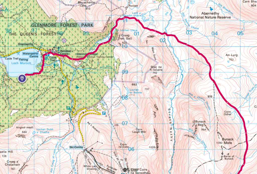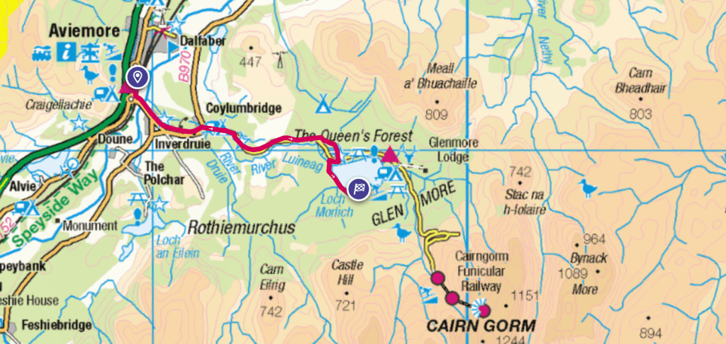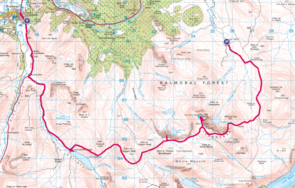 Map area link. Google Maps location links: Aviemore, Loch Morlich, Fords of Avon, Braemar, Loch Callater, Lochnagar, Gelder Shiel, Crathie, Ballater