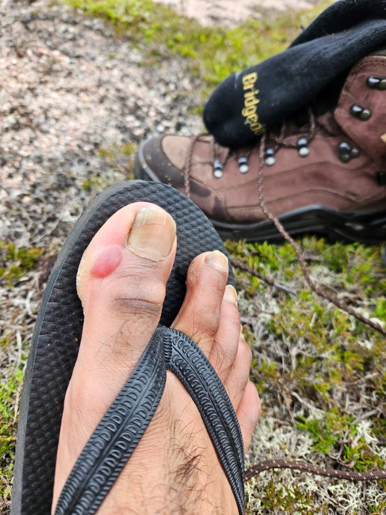 I had, unfortunately, developed a rather angry-looking blister on my right big toe. I was doing something rather foolish-sounding in doing a week’s hike in a completely new pair of walking boots, but these are actually my third pair of exactly the same boots which I really like – each of the previous times, they’ve somehow been entirely fine instantly, without needing breaking in. They haven’t lasted me that long – I think I’d done about 900mi in the previous pair, and they hadn’t been waterproof for the last third or so of that – but I do like that I just know they fit well and are comfortable, so I’d gone ahead and bought another pair. Alas, it seems I was a bit too hubristic in going for such a serious walk immediately. My blister was also in the exact spot where my last two pairs had eventually split an outer seam, suggesting that I am pressing against the boot there much more than normal. Oh well, I put on blister plasters for the rest of the trip, and it didn’t burst or cause me any notable discomfort. And just one blister for a new pair of boots on a serious week-long hike is still pretty good going, I think!