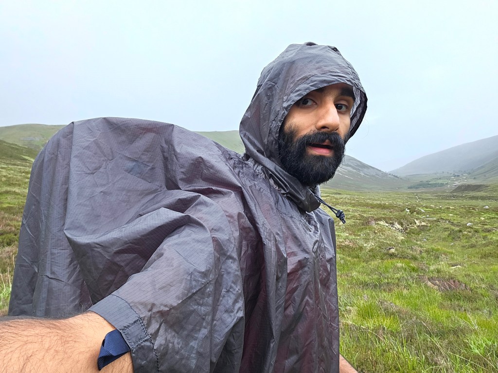 Day 3 would be an easier one, and without any major sights to see; slightly shorter at about 14 miles, but more importantly, pretty much all flat or downhill, coming out of the central Cairngorms to the village of Braemar. The weather was a bit worse with some on-and-off light rain, so here are some attractive photos of my in my poncho looking like I’m wearing a bin bag! I was glad it was a more straightforward day as I was feeling more tired and less motivated than the day before, though nothing too bad.