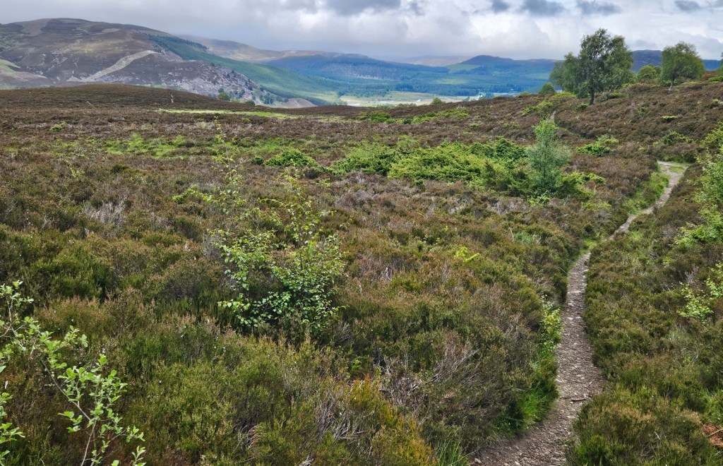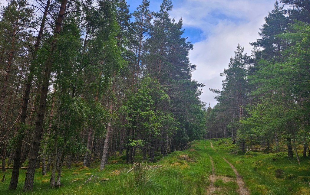 The day’s walk started with two-and-a-bit of miles of gentle descent on a track through sloping moorland, then another mile or so through the woods surrounding Balmoral Castle.