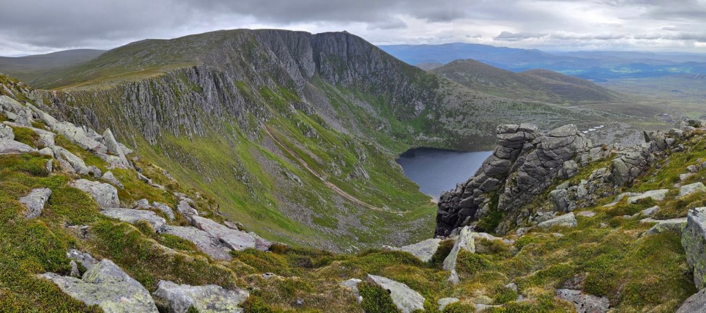 Loch Avon, at the head of the glen and river of the same name, is surrounded on three sides by steep slopes leading up to some of the highest of the Cairngorms. It was indeed a spectacular spot, and well worth the little side trip! I’d love to come back on a sunny day and see it then, and get up into the high hills around it.