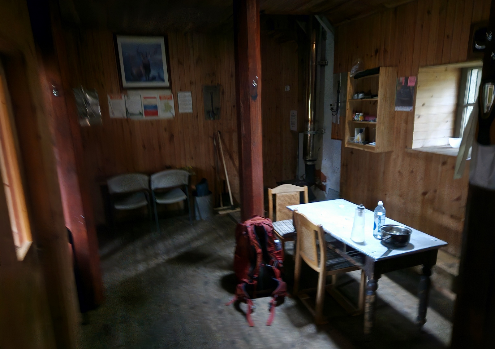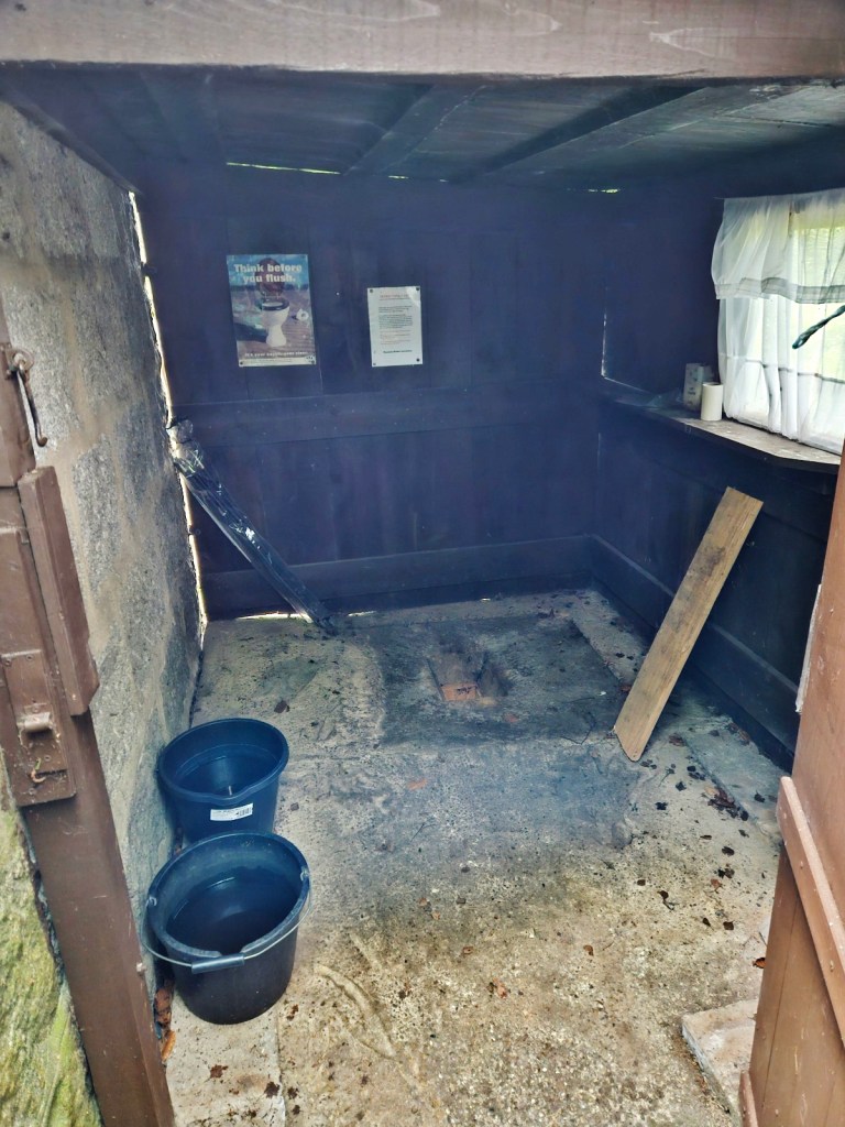 This bothy, luxuriously, has a tap and a toilet – the latter being a room with a toilet depression in the floor with a sewer pipe leading out to a septic tank, to be flushed with a bucket you can fill at the tap. Very convenient!