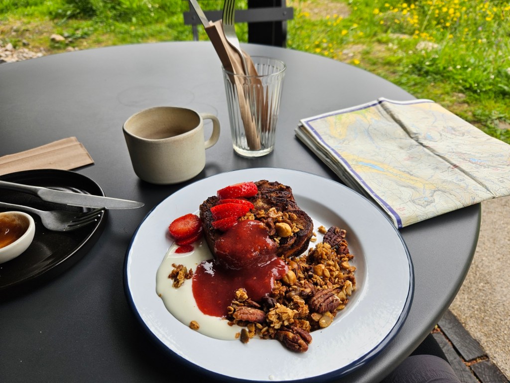 Crossing the River Dee on a footbridge, I came into the villlage of Crathie, where I treated myself to brunch in a café! The main option I could have was a nutty vegan French toast with yoghurt and berries – very much not the sort of thing I’d normally pick, but it was quite nice, and I also had a chai and a little mini snack pie with peas in.