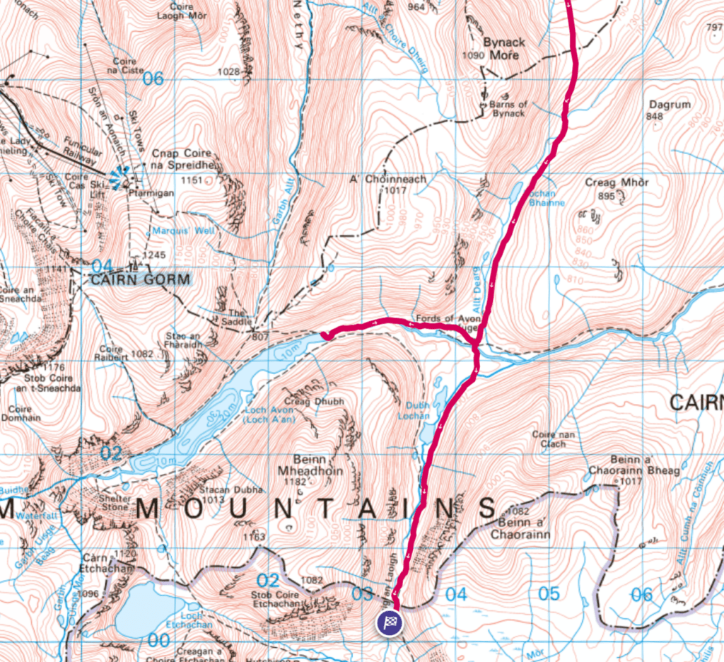 I turned right a little before Ryvoan, crossing the River Nethy and then taking the path that heads up the mountain Bynack More, though I wouldn’t go to the 1060m top, instead ascending only to about 800m before curving around to the east on a path through Coire Odhar to get down into the giant Glen Avon – I did want to try going to a mountaintop, to see if I could do that comfortably with a pack on, but I thought perhaps not on the first day. There’s a lower-level path through Strath Nethy that I’d considered, but having read it could be really boggy I’d decided to avoid.