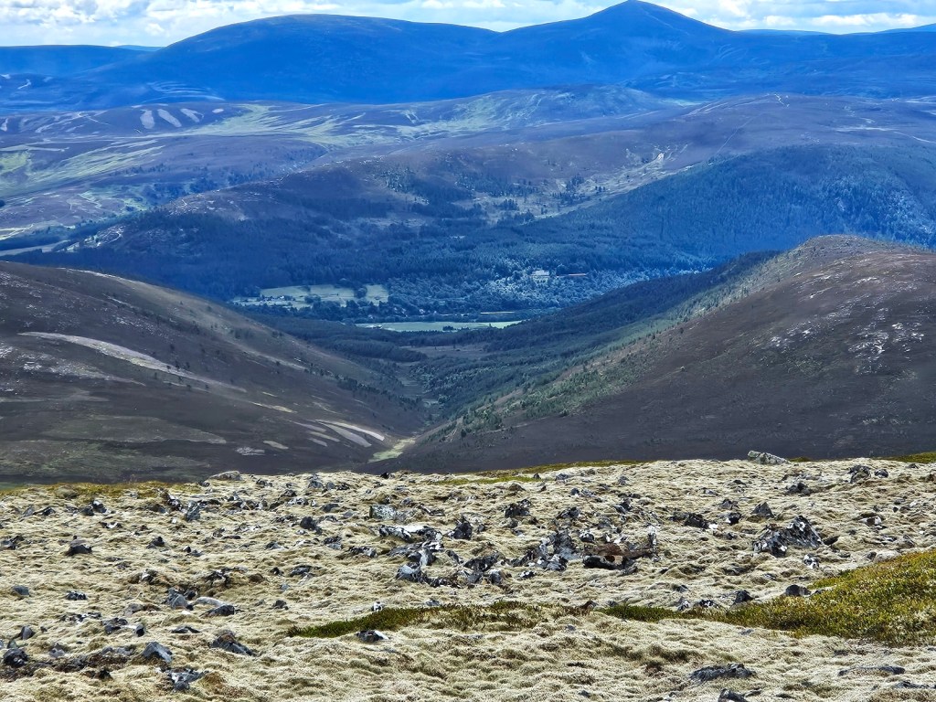 To the south, I could clearly see Lochnagar, where I was the day before, and the easternmost Munro, Mount Keen. To the west were the main bulk of the Cairngorms, and to the east just rolling, green, hilly countryside. I could just about make out the sea to the southeast.