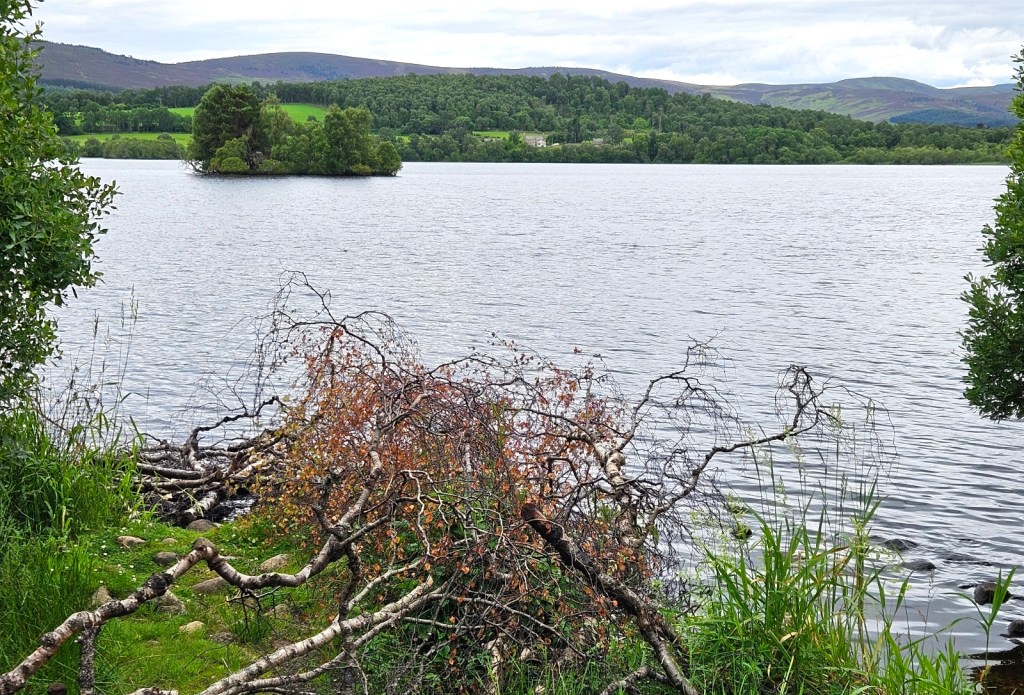 As well as Loch Kinord just being a pretty place – it’s a country park type thing which seemed to be popular for short walks – there’s the remains of a crannog in the lake. A crannog is a kind of prehistoric dwelling build on an artificial island. Since they were wooden, all one can see nowadays is the island itself, so if you ever see a small, circular island in a Scottish loch, it might well be one!