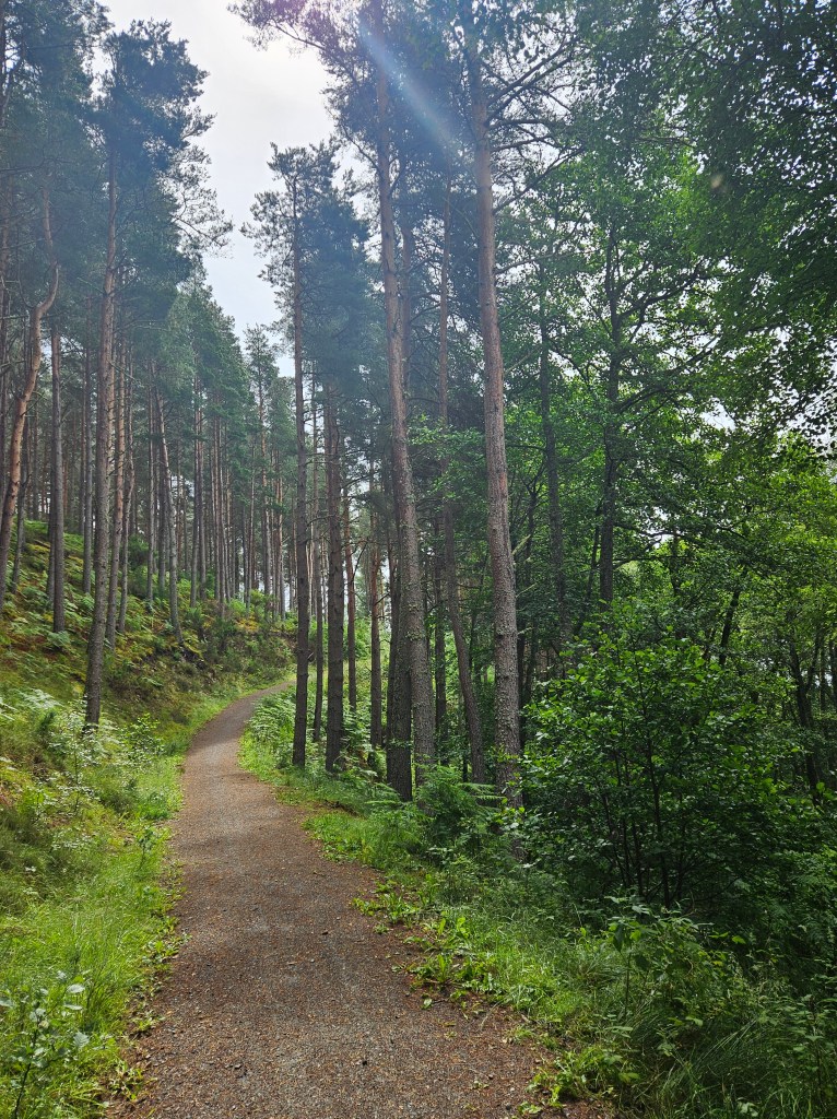 Just before Kincardine O’Neill, there’s a section where the Way leaves the old rail route, passing through some pretty woods with a little ascent and descent.