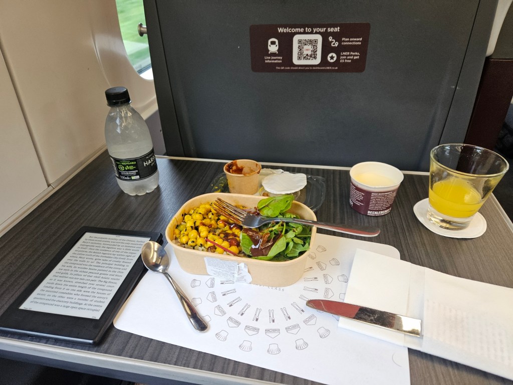 The journey was indeed nice and comfortable as well as scenic, and I got some tea, orange juice, water, a chickpea salad and a nice lemony dessert pot from the catering!
