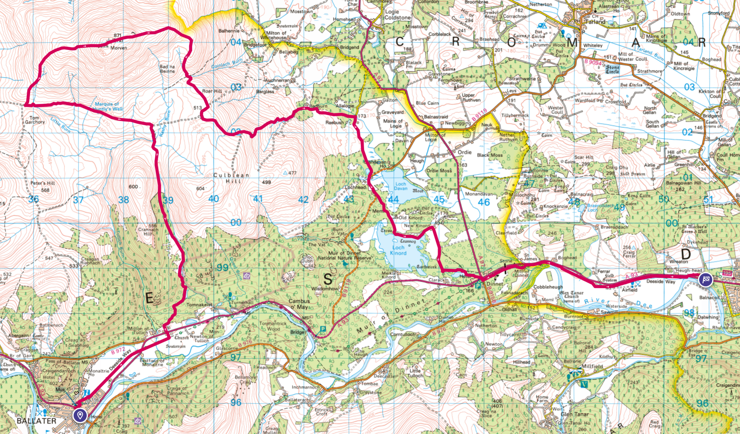 Map area link. Google maps location links: Ballater, Morven, Loch Kinord, Dinnet, Aboyne, Kincardine O’Neill, Aberdeen