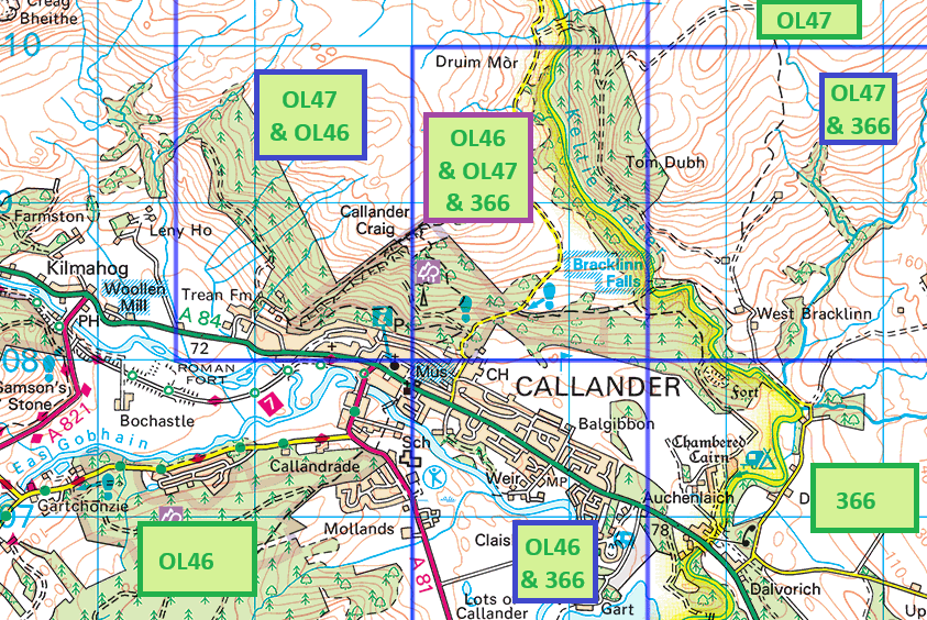 After that, we carried on driving! One final note about Callander though: I had a tough little time working out exactly which map this visit should count for! The town is right in the corner where maps OL46, OL47 and 366 meet, none of which I’d visited or posted about before. As you can see in the map above, they overlap in a pretty complex way. I initially thought that I’d only visited overlap areas and, as such, this could only be a provisional visit under The Rules, but I eventually realised that we’d briefly, while on the meadows by the river, been in the area unique to OL46, so it’s a proper visit!