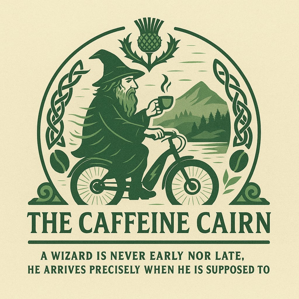 As one longer, fun aside: during our walking and driving, Geochundere came up with the idea that, in another life, he’d like to run a little coffee trailer, pulled by an electric bicycle, which he could ride into popular wilderness areas, away from roads, to use to sell coffee to hikers and other adventurers. He liked the idea of not being always in the same place, but just sometimes turning up places and being a nice surprise for those who found him. I also mentioned my idea I’d had before for living beside a popular long-distance walking route and having an honesty shop in an outbuilding, which I wrote about in my Clun Forest post. We ended up workshopping the trailer idea a fair bit, to the point of AI-generating some logos that Geochunderer was rather pleased with!
